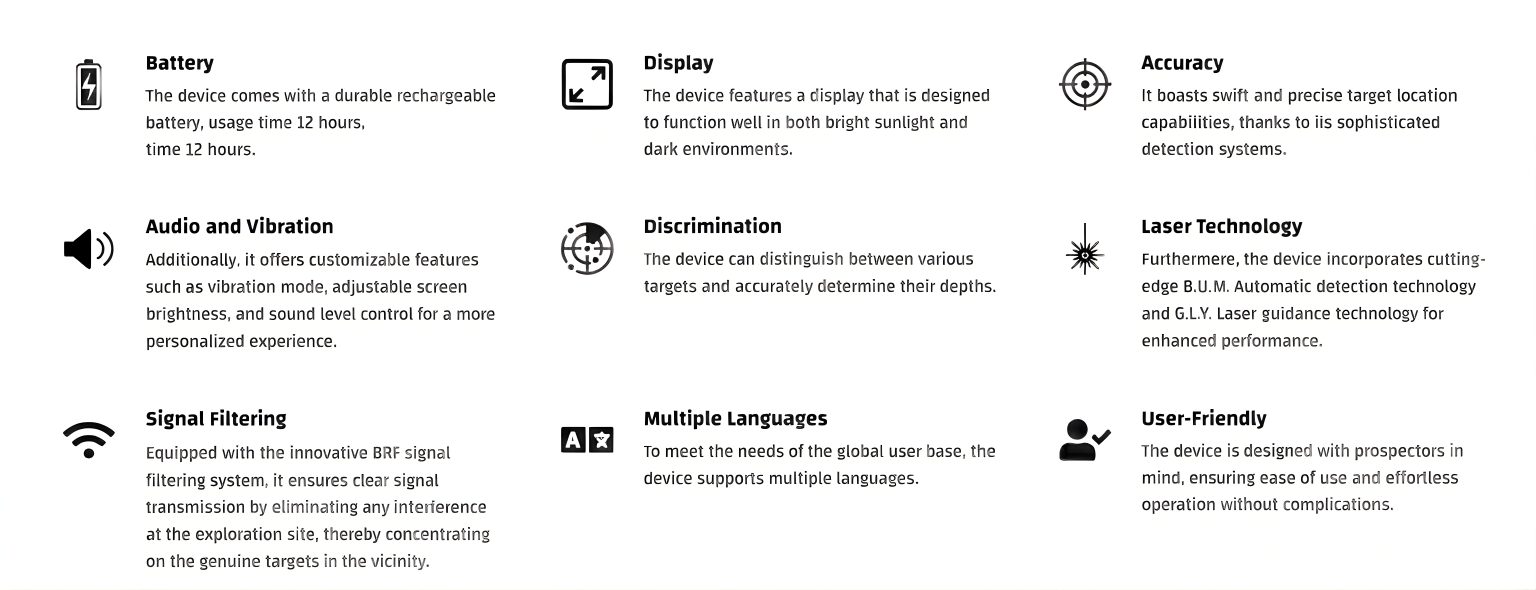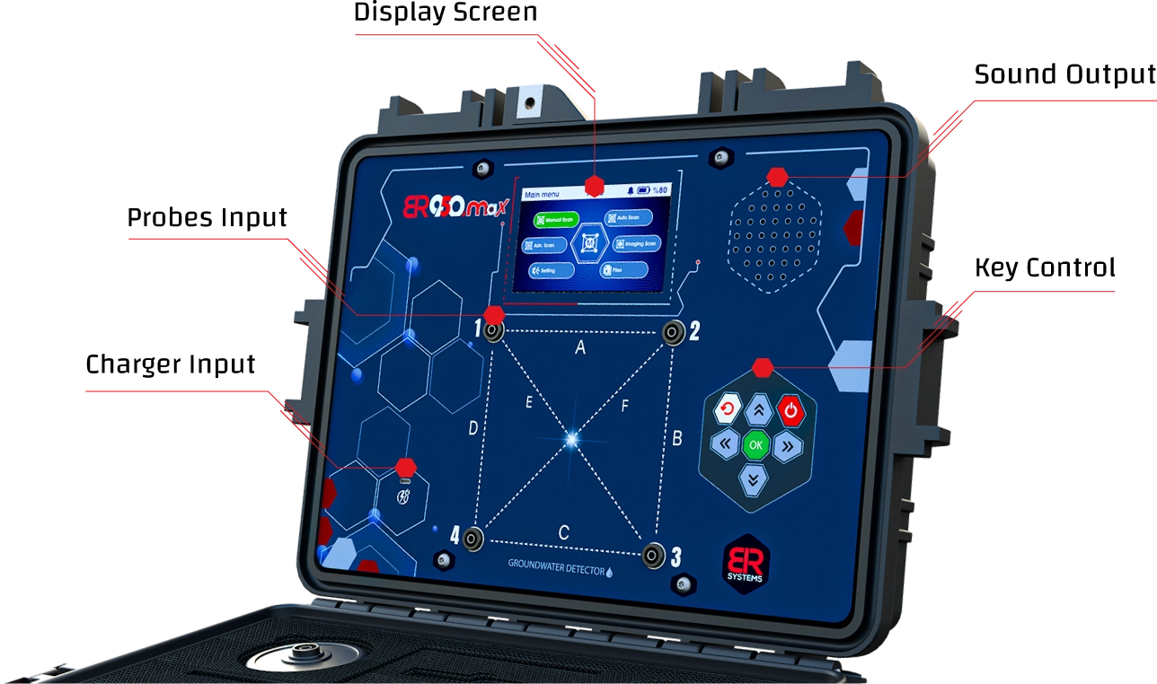 Engineered for professional groundwater exploration, the BR 950 Max delivers scientifically reliable results, accurately identifying multiple types of water—including fresh, saline, mineral, sulfur, deep groundwater, and mixed surface water. It also provides detailed on-screen readings of depth, density, and salinity levels, giving users a complete and accurate analysis of subsurface water sources.