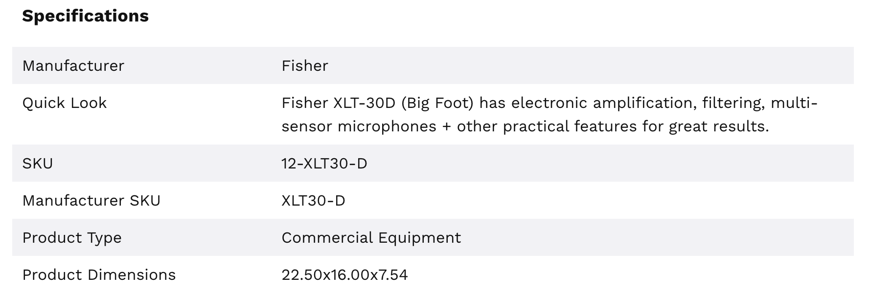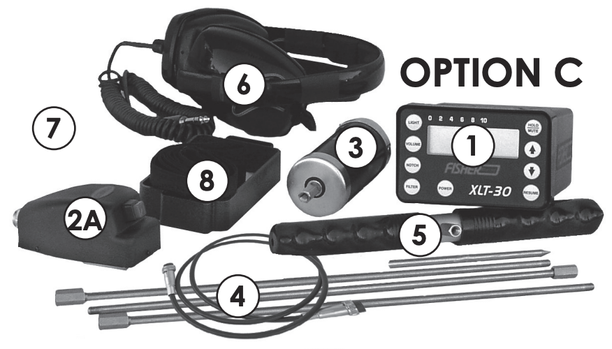 The Fisher XLT-30 is available in three configuration options to match different leak detection needs and working environments. Users can choose between Option A (Big Foot ground microphone), Option B (Multi-Sensor for both hard and soft surfaces), or Option C (Little Foot sensor for compact and indoor applications), allowing professionals to select the most suitable setup for their specific field conditions.