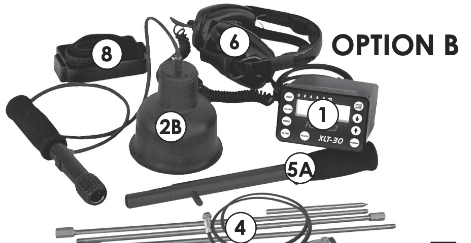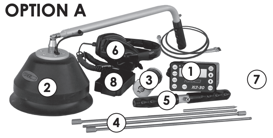 The Fisher XLT-30 is available in three configuration options to match different leak detection needs and working environments. Users can choose between Option A (Big Foot ground microphone), Option B (Multi-Sensor for both hard and soft surfaces), or Option C (Little Foot sensor for compact and indoor applications), allowing professionals to select the most suitable setup for their specific field conditions.